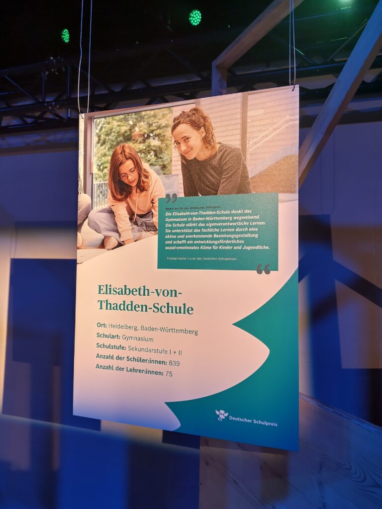 Der Vorsitzende der Schulpreis-Jury, Thomas Häcker, bescheinigt uns zusammenfassend: „Die Elisabeth-von-Thadden-Schule denkt das Gymnasium in Baden-Württemberg wegweisend. Die Schule stärkt das eigenverantwortliche Lernen. Sie unterstützt das fachliche Lernen durch eine aktive und anerkennende Beziehungsgestaltung und schafft ein entwicklungsförderliches sozial-emotionales Klima für Kinder und Jugendliche.“