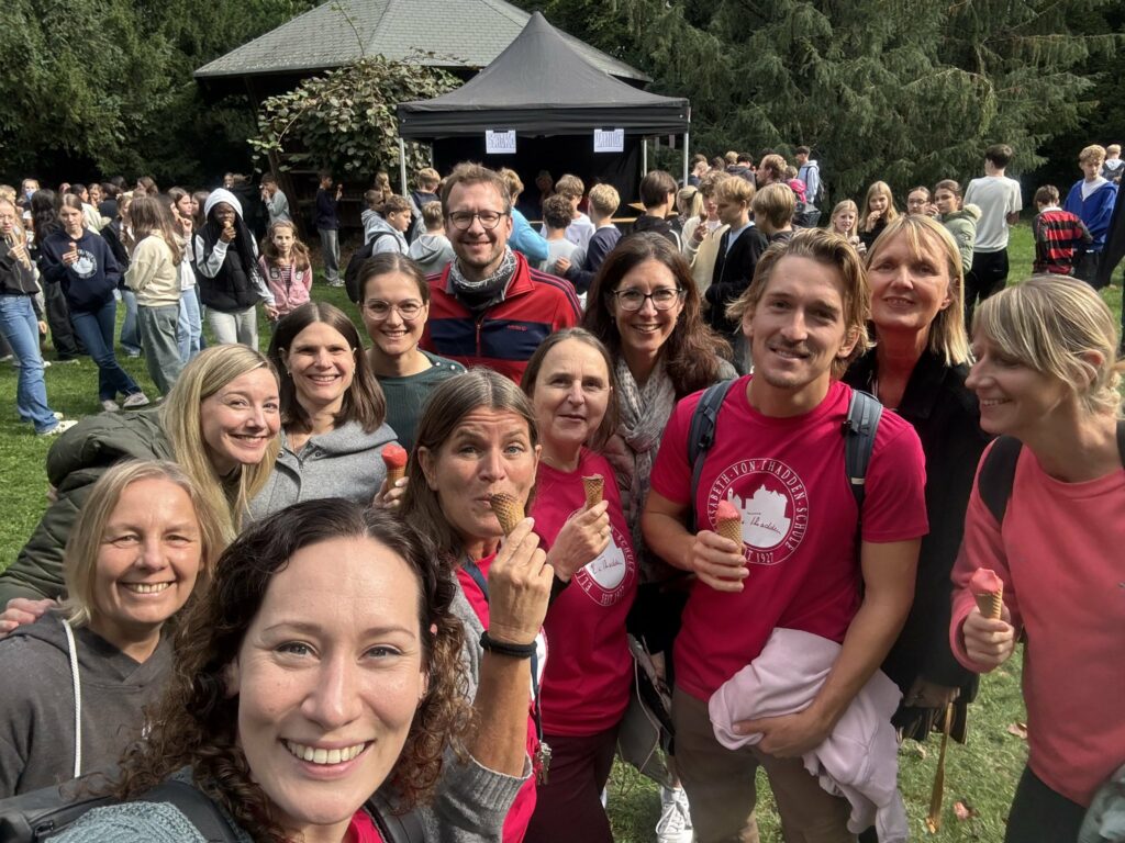 Daran ist zu spüren: Wir sind als Elisabeth-von-Thadden-Schule im Kreis der guten Schulen in Deutschland etabliert und werden als solche wahrgenommen. Was für eine Anerkennung! Was für ein Erfolg und Grund zur Freude! Deshalb haben wir als Schulgemeinschaft im Anschluss an die Übertragung im Thadden-Park gefeiert und alle mit Eis von ok kool überrascht. Danach ging’s dann wieder in den Unterricht…